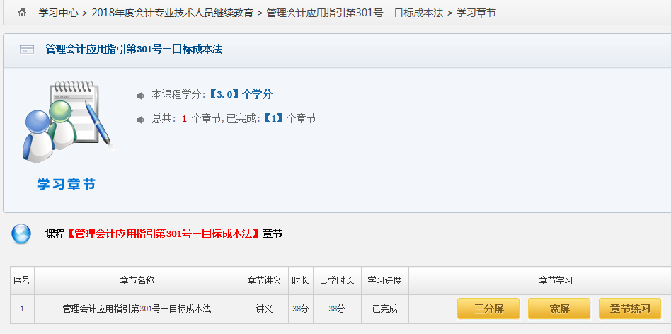 学员可以很据自己的带宽情况,选择“三分屏”或者“宽屏”进入学习。选择章节练习,可进入在线练习页面。三分屏能够和讲义对照,建议大家优先选用三分屏学习。