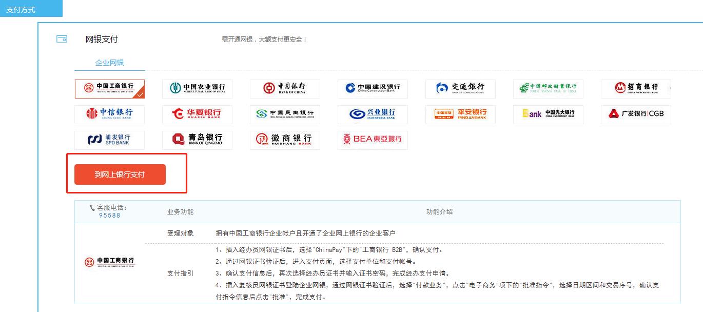选择支付方式之后,点击提交订单,页面跳转到收银台页面,点击选择要支付的银行到对应网上银行支付本次订单。